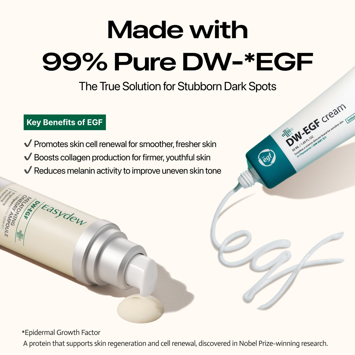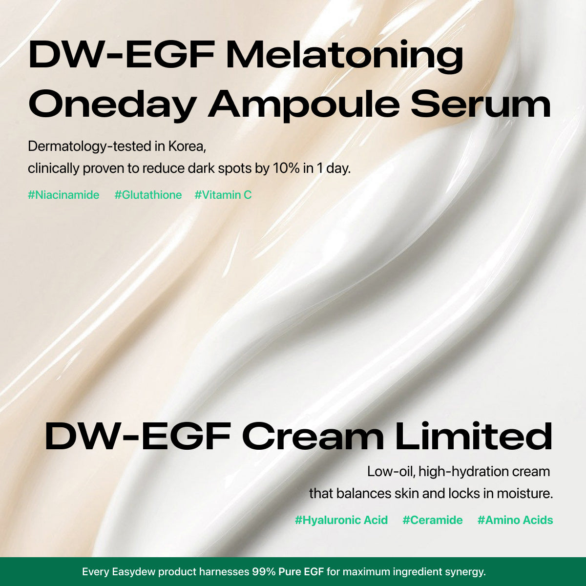 - Targets dullness, fine lines, and sagging with melatonin, collagen, and DW-EGF