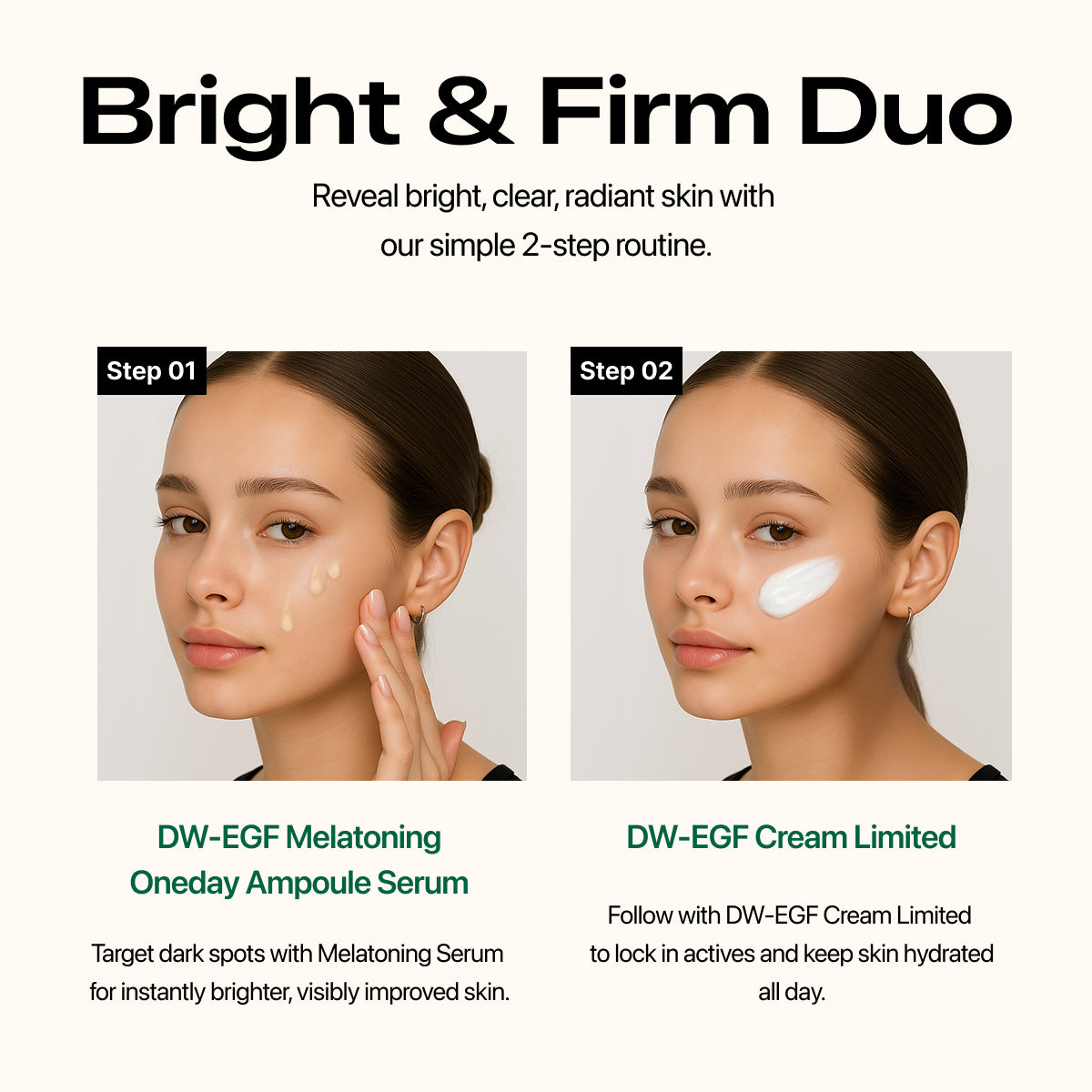 - Combines brightening ampoule + firming cream for complete skin rejuvenation